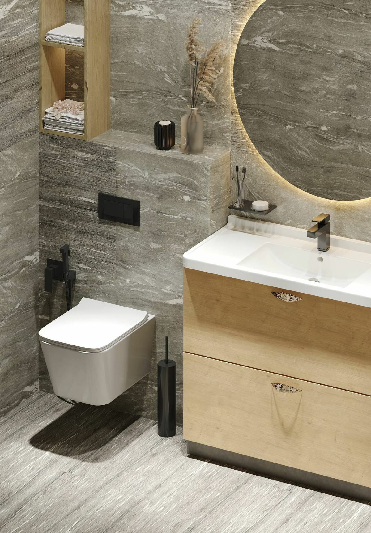 A fürdőben egy szürkés, kőmintás burkolat foglalja el a legnagyobb felületet, még az öblítőegységre is jutott belőle, ami ennek köszönhetően teljesen egybeolvad a fal mintájával.